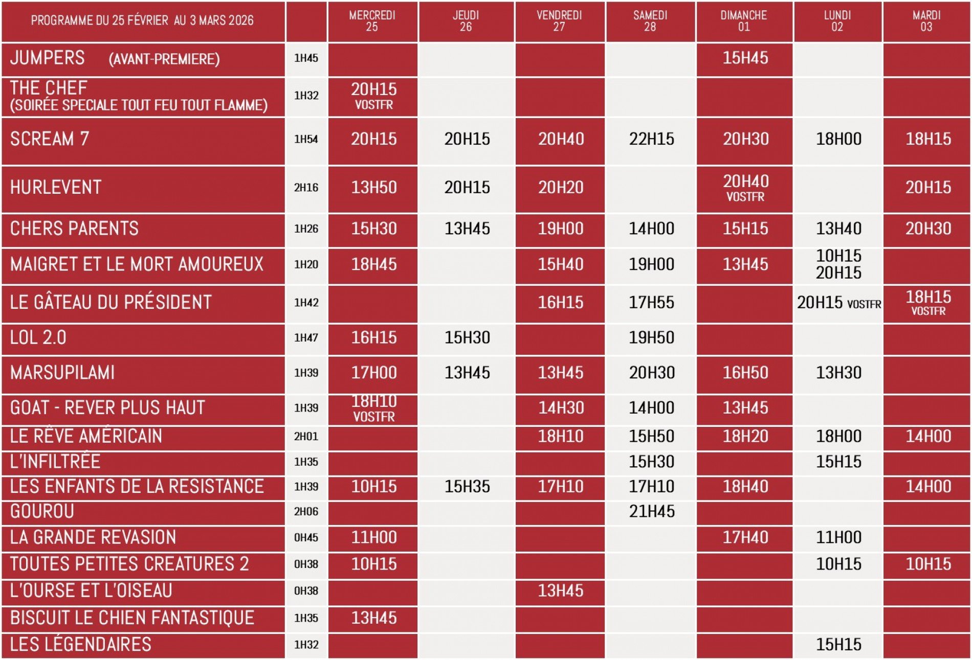Les horaires de votre cinéma